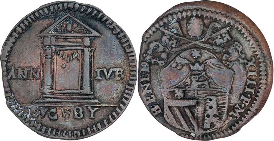 Quatrino b.l. (1725) - svaté dveře, mincovna Gubbio, KM.107, Berm.2593, 1.895g, kraj.stř., pěkná patina