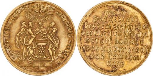 Norimberg - křestní medaile b.l. (18.-19. století) - scéna křtu, Duch svatý, opis / 8-řádkový nápis, dvě rozetky, Nesign., Nepunc., Au 21mm, 3.475g, vl.škr.