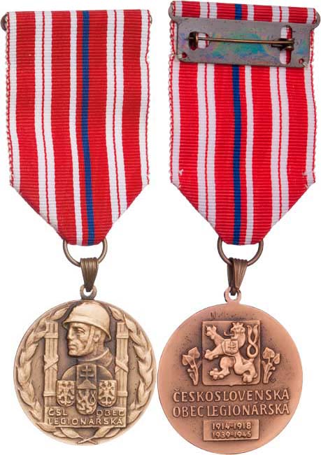 Čsl. obec legionářská - pamětní medaile, Sign.MV (Michal Vitanovský), bronz 38 mm se závěsem a stuhou, tři malé stužky, odznak, původní etue