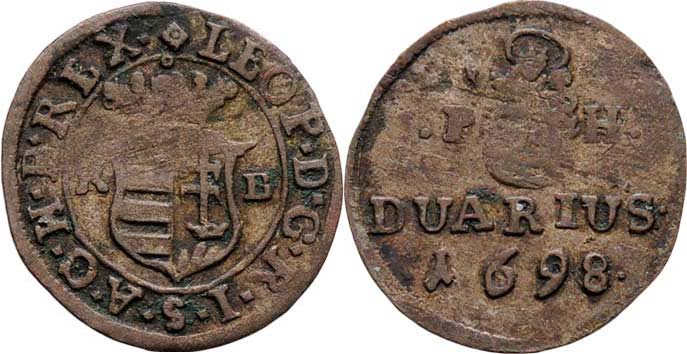 Duarius (1/2 Krejcar) 1698 KB, Nech.1245, Husz.1499, 0.563g, nedor., pěkná tmavá patina