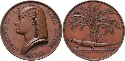 Galle - AE medaile na obsazení Horního Egypta (1799) - Napoleon jako faraon, písmo / krokodýl na řetězu u palmy, Sign., 35mm, 19.905g, Zeitz.9, krásná patina