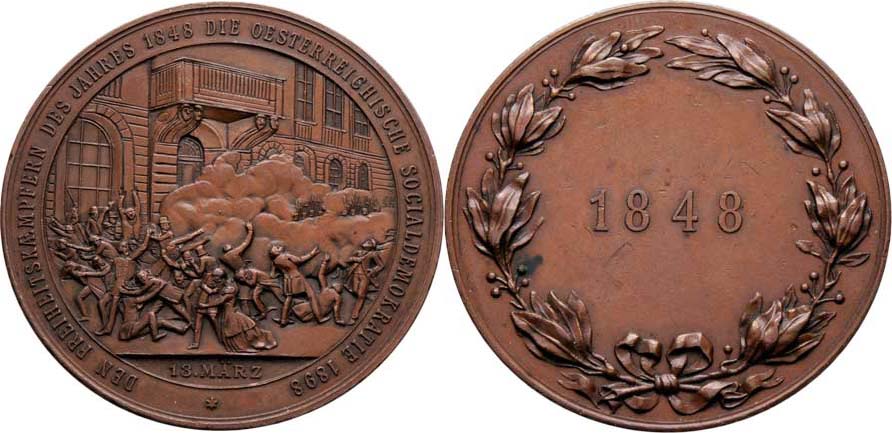 Rak. sociální demokracie - 50 let revoluce 1848/1898 - střetnutí občanů s vojskem, průčelí budovy, opis / letopočet ve věnci, Nesign., měď 50 mm, rysky, patina