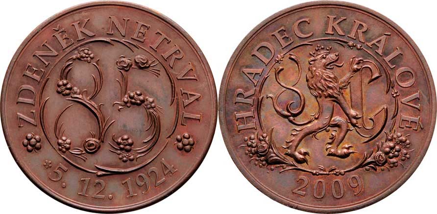 Zdeněk Netrval - AE jeton na 85.narozeniny 2009 - Květinová "85", opis / český lev s písm."G", opis, květiny, Nesign.(Soušek), patinovaná měď 30mm, 8.998g