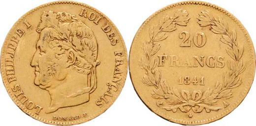 20 Frank 1841 A, Paříž, KM.750.1 (Au900), 6.436g, dr.hr., dr.rysky, pěkná patina