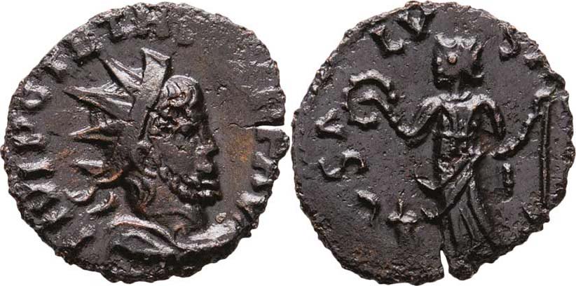 AE Antoninianus, Rv:"SALVS.AVG.", stojící Salus, podobný jako S.3080, RIC.121 - minc. Vienna v Galii - blíže nedatován, nep.napr.okraj, nedor., patina