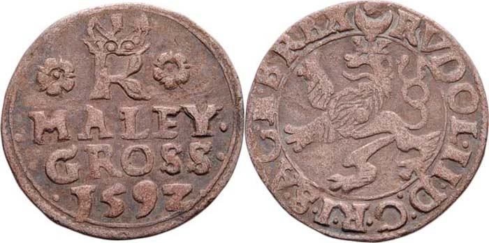 Malý groš 1592, Jáchymov-Hoffmann, HN.8b (opis 7c), nápis ". MALEY ./. GROSS ./. 1592 .", 0.776g, nedor., pěkná patina