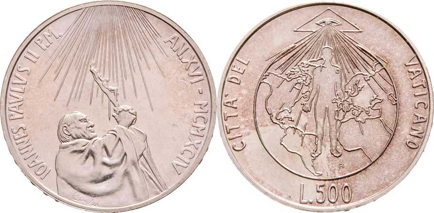 500 Lira 1994 R - XVI.rok pontifikátu, Y.251 (Ag835, 11.0g), patina
