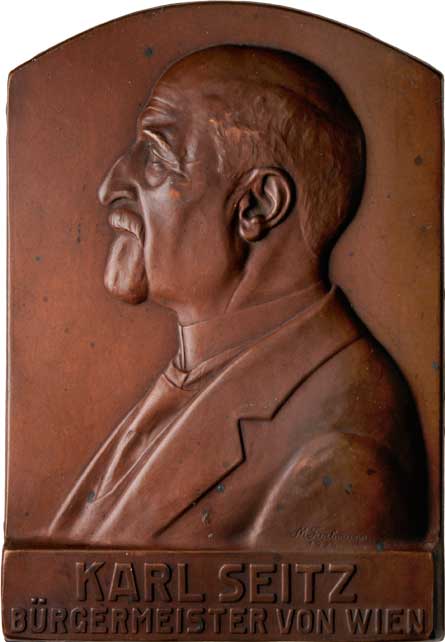 Farbann - Karl Seitz, vídeňský purkmistr 1924 - poprsí zleva, 2-řádkový nápis, Sign., měděný plech 81x116 mm, pěkná patina