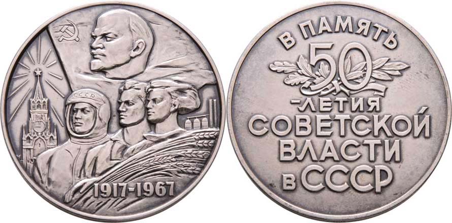 SSSR - 50 let revoluce 1967 - hlava Lenina, Kreml, kosmonaut, personif. průmyslu a zemědělství, vročení/ nápis a ratolesti, zn."LMD", Ag925, 50mm, 76.378g