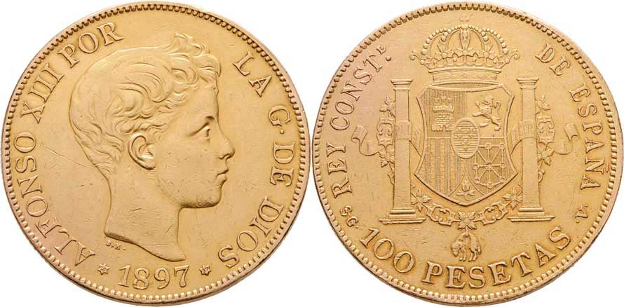 100 Peseta 1897/1897 SG-V, Valencia, KM.708 (Au900), 32.202g, dr.hr., vl.škr., dr.rysky, pěkná patina R!