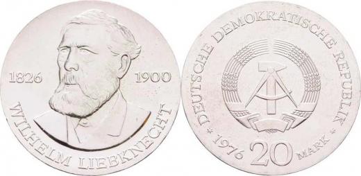 20 Marka 1976 - Wilhelm Liebknecht, KM.63 (Ag625, 20.9g, 96.000 ks), skvrnky, kartička R!