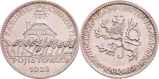 První vzájemná pojišťovna v Praze 1928 - Záslužné činnosti - znak, opis / Boží oko, dům, obilí, písmo, Sign., Nepunc., Ag 30mm, 9.070g, patina
