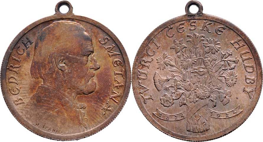 Bedřich Smetana - k stým narozeninám 1824/1924 - poprsí zprava, nápis / kytice se stuhou, nápisy, Sign., Ag750, 23 mm s původním raženým ouškem, pat.
