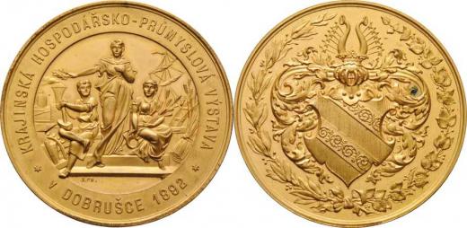 Abrahám - hospodářsko průmyslová výstava 1892 - alegorie průmyslu, zemědělství a obchodu, opis / znak ve věnci, zlac.bronz 52mm, Nesign., zn."JCH", skvr.