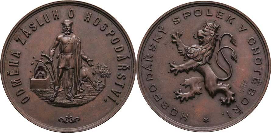Kříž - Hospodářský spolek - odměna zásluh b.l. - Přemysl s pluhem, úl, lípy a opis / český lev, opis, Sign., měď 38mm, MZČ.164/27, Don.4196, pěkná patina