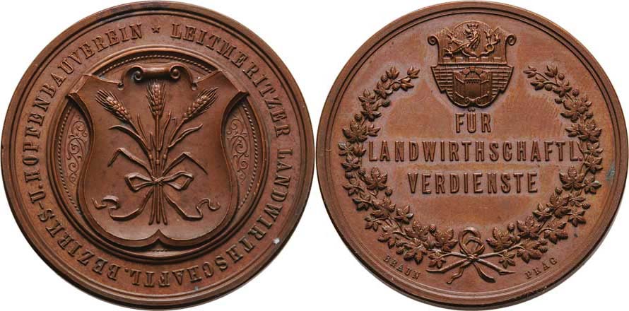 Braun - Okresní hospodářský svaz - Za zásluhy b.l. - znak města a 3-řádkový nápis ve věnci / emblém svazu v kartuši, opis, Sign., bronz 36 mm, nep.hr., patina