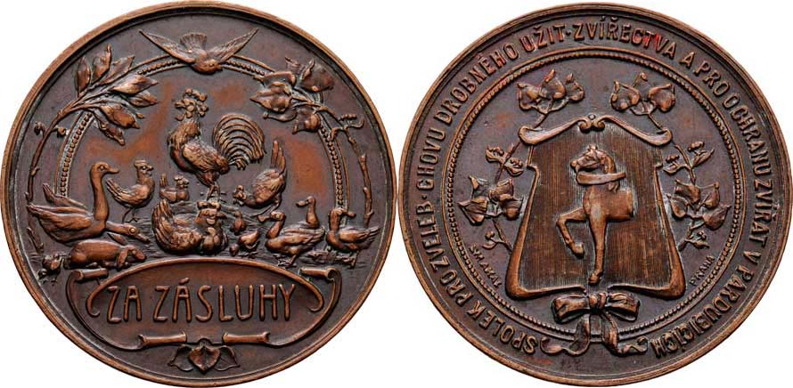 Šmakal - Spolek chovatelů dr.zvířectva - Za zásluhy - městský znak, lipové ratolesti, opis/ drůbež, králík, ratolesti a nápis, Sign., bronz 35mm, patina, téměř