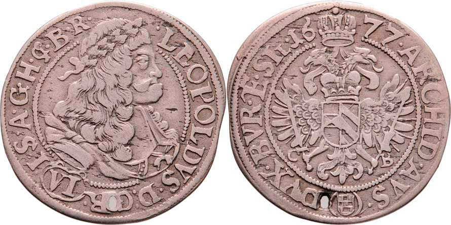 VI Krejcar 1677 CB, Břeh-Brettschneider, MKČ.1698, Nech.922, 2.848g, malá dírka, pěkná patina R!