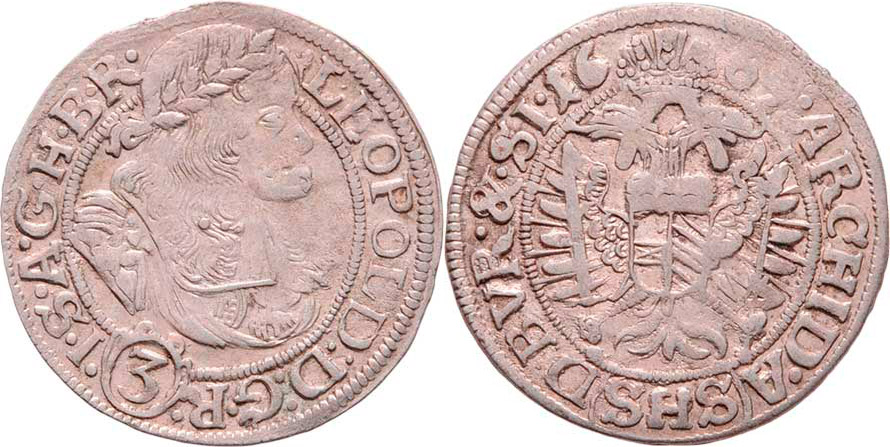 3 Krejcar 1669 SHS, Vratislav-Hammerschmidt, dělení opisů: "...G.R.(3).I.S.../...A.(SHS).D.BVR.&.SI." MKČ.1622, Nech.739, 1.641g, kraj.stř., nep.nedor.