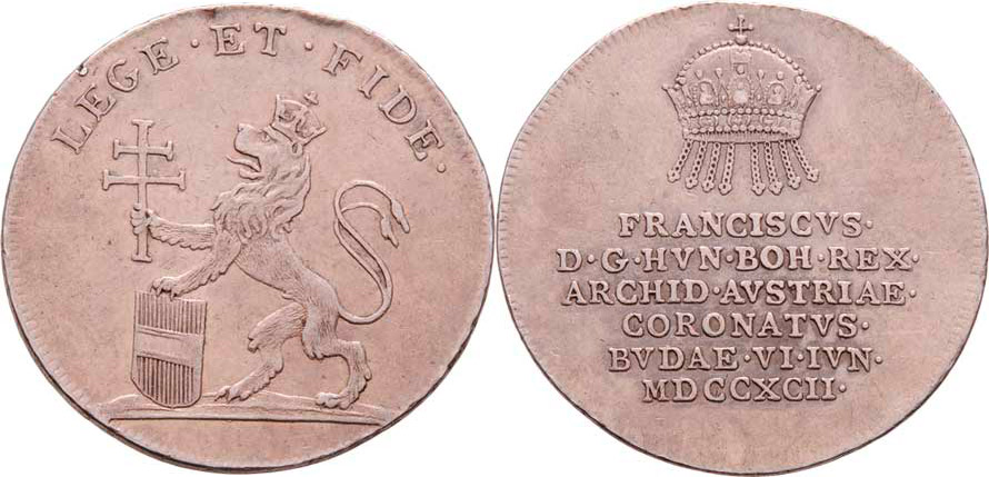 Větší jeton na korunovaci v Budíně 6.6.1792 - stojící lev se znakem a křížem, opis / koruna a 6-řádk.nápis, Ag 24mm, 4.360g, Nov.C.2b, M.2261, dr.hr., pěkná pat.