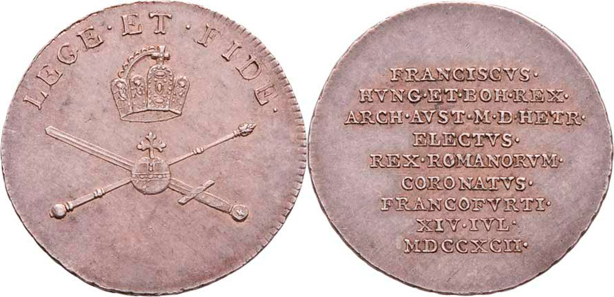 Menší jeton na korunovaci ve Frankfurtu 14.7.1792 - koruna, žezlo, meč a jablko, opis / 9-řádkový nápis, Ag 20mm, 2.188g, M.2270, H.3334, Nov.E.8b, pat., tém.