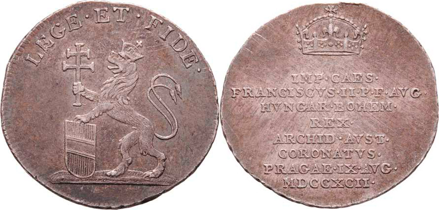 Menší jeton na korunovaci v Praze 9.8.1792 - stojící lev se znakem a křížem, opis / koruna a 8-řádk.nápis, Ag 20mm, 2.205g, Nov.H.4b, ČS.1438, nep.just., patina