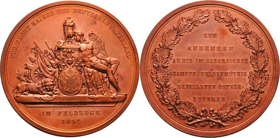 Roth - Na paměť padlých ve válce s Dánskem 1864 - lev a anděl smrti sedící vedle trofejí, opis / nápis ve věnci, Sign., měď 70mm, 118.501g, M.2701, nep.rysky