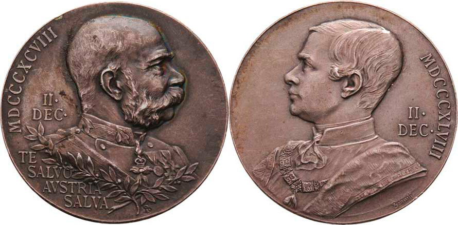 Scharff - medailka na 50 let vlády 1898 - poprsí zprava, nápis, vročení / mladé poprsí zleva, opis, vročení, Punc., pat. Ag 26mm, 7.980g, ČS.1613, H.3883