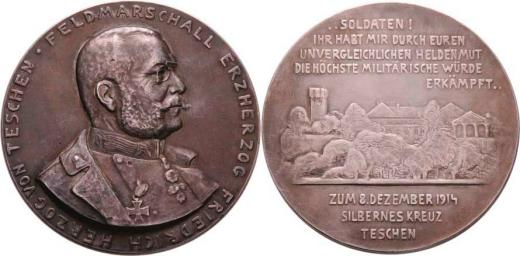 Helene Scholz - AR pamětní medaile 8.12.1914 - poprsí zprava, opis / těšínský zámek s parkem, 8-řádk. něm. nápis, Sign., Punc., patin.Ag800, 55mm, 67.952g, tém.