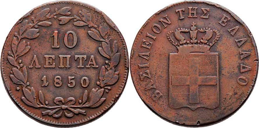 10 Lepta 1850, KM.29 (Cu), 12.796g, nep.vady mater., hr., dr.rysky, pěkná patina R!