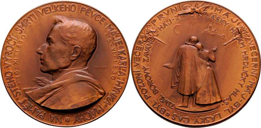 K.H.Mácha - AE medaile na 100.výročí úmrtí 1936 - poprsí zleva, opis / milenci pod Bezdězem, dva opisy, Sign., patinovaný bronz 60 mm, hrana