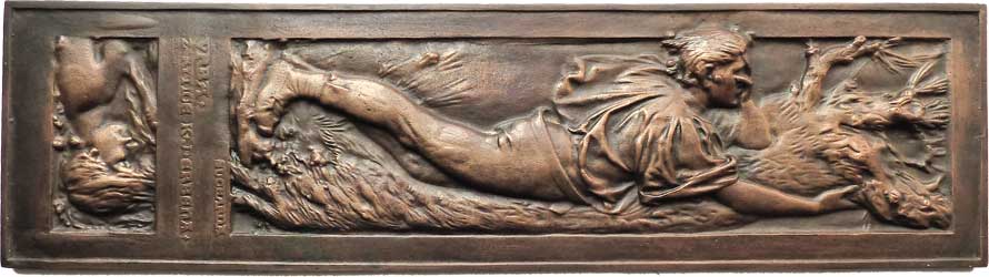 Vrba - jednostranná litá plaketa b.l. (1897) - muž objímající kmen vrby, zakletá žena, Sign., litý bronz 160x580 mm, MZČ.200/6, pěkná patina R!