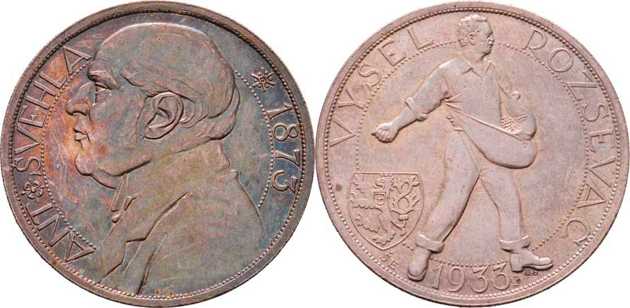Antonín Švehla / Vyšel rozsévač 1933 - poprsí zleva, opis / rozsévač, malý znak ČSR, opis, Sign., Punc., Ag987, 30mm, 10.160g, PŠ.140, nep.hr., nep.rys., pat.