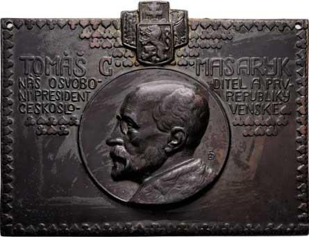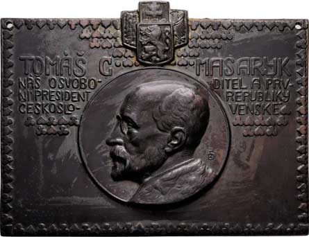 Tomáš Garrigue Masaryk - plaketa, b.l. (cca 1919) Poprsí zleva, opis, dělený státní znak, nápis, patinovaný litý zinek 120x95 mm, dvě původní dírky
