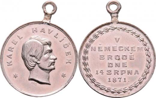 Kříž - odhalení Havlíčkovy pamětní desky 14.8.1871 - hlava zprava, opis / 6-řádkový nápis ve věnci, Sign., cín 27 mm s původním raženým ouškem, PZ.330, téměř