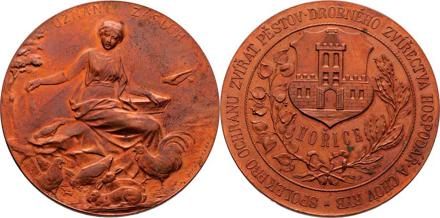 Pichl - spolek pro ochranu zvířat a chov ryb b.l. - městský znak, věnec a písmo / sedící žena sype zrní drůbeži, nápis, Sign., bronz 45mm, pat., starý lístek