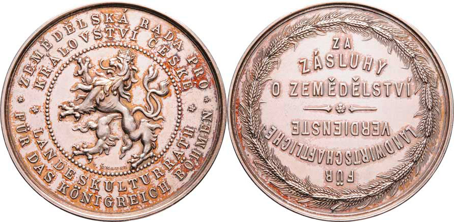 Šmakal - Zemědělská rada pro Království české b.l. - český lev, dvojitý opis / česko-němec. nápis ve věnci Sign., Ag800, 42mm, 24.969g, jako ŠFP.6b, patina