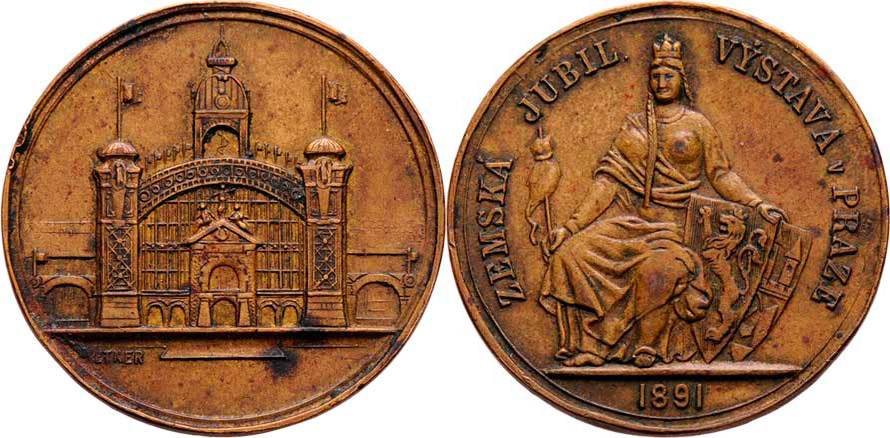 Kettner - upomínková medaile s Čechií 1891 - sedící Čechie čelně, český opis / Průmyslový palác, Sign., mosaz 25 mm bez ouška, ŠFP.41b, hr., skvrny, patina