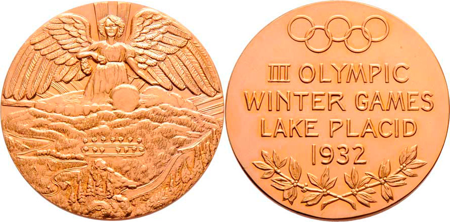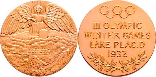 Lake Placid 1932 (pozdější) - III.zimní olympijské hry - Niké nad krajinou/ olymp.kruhy, 4-řádkový nápis a vavřín. ratolest, Nesign., zlacený bronz 50 mm