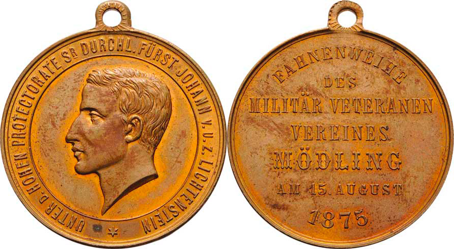 Mödling 1875 - svěcení praporu 15.8., protektor kníže Johann Lichtenstein zleva, něm.opis/ němec. 7-řádkový nápis, mosaz 32 mm s původním ouškem, Haus.5691, pat.