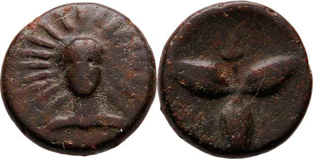 AE 12mm, hlava Helia čelně / tři obilná zrna, monogram, SG.neuvádí, 2.172g, pěkná patina