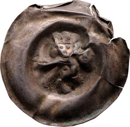 Brakteát český, Ca.844, F.XXII/21 (2227), 0.546g, pomačkaný, naprasklý, pěkná patina