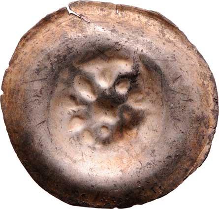 Brakteát moravský, Ca.1001, F.XXII/18 (2205 a 2348), 0.379g, pomačkaný, pěkná patina