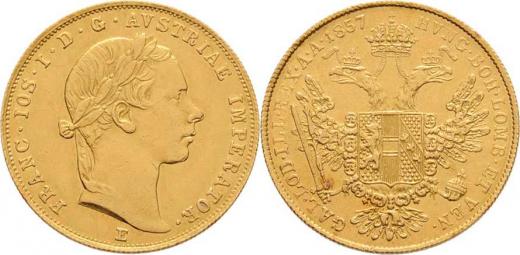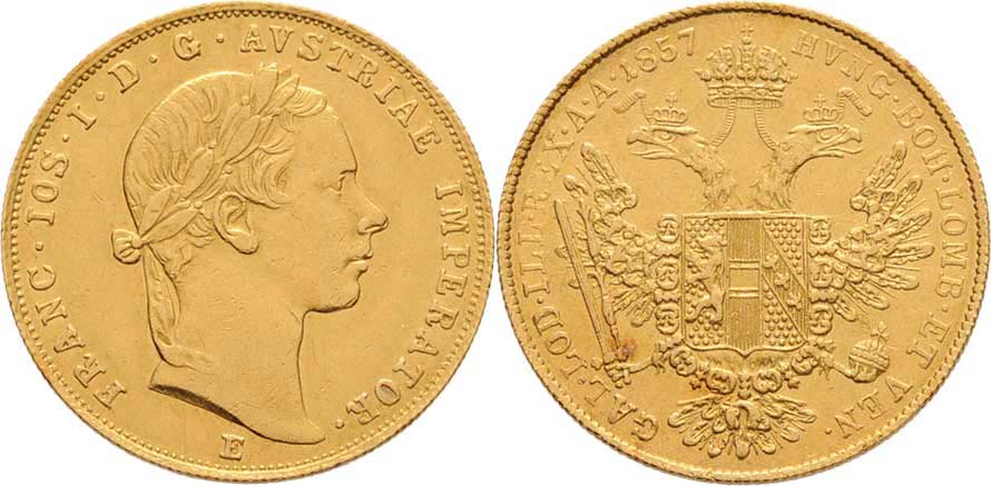 Dukát 1857 E, 3.456g, nep.hr., nep.rysky, skvrnka, patina