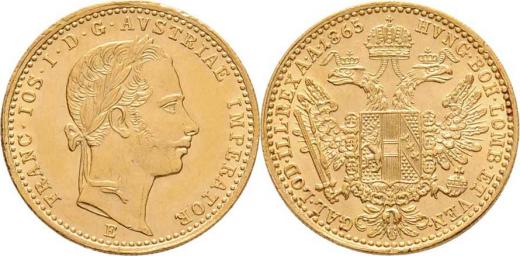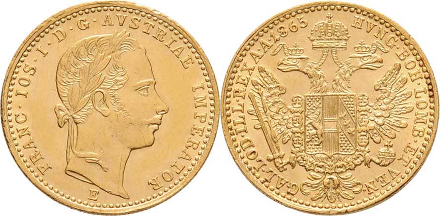 Dukát 1865 E, 3.485g, dr.hr., nep.rysky, téměř R!