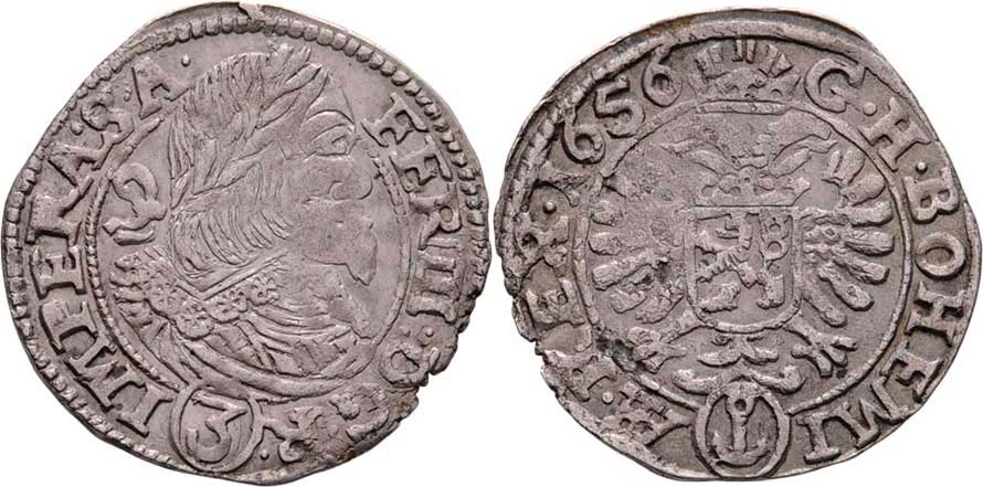 3 Krejcar 1656, Praha-Margalík, J.4a, MKČ.1181, 1.648g, drobné vady materiálu na hraně, nep.nedor., pěkná patina RR!