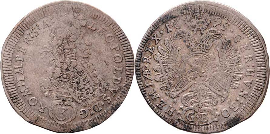 3 Krejcar 1695 GE, Praha-Egerer, MKČ.1427, Nech.204, líc i rub bez vnitřního perlovce, 1.537g, nep.nedor., tmavá patina RR!