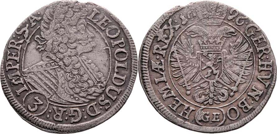 3 Krejcar 1696 GE, Praha-Egerer, MKČ.1425a, Nech.205, 1.651g, mírně exc., nep.olámaný okraj, pěkná patina