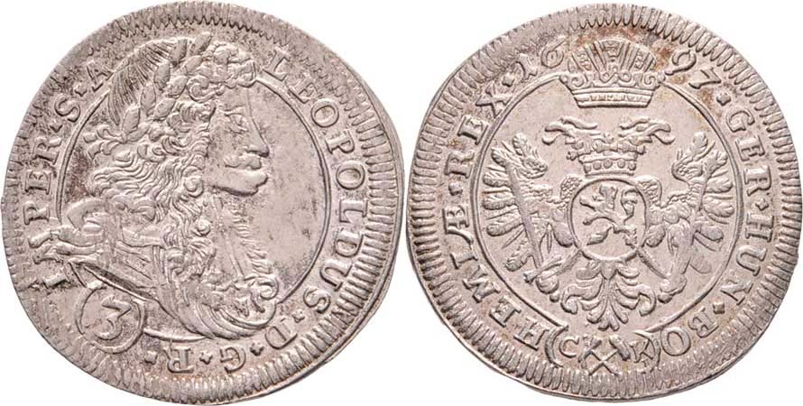 3 Krejcar 1697 CK, K.Hora-Krahe, Nech.316, MKČ.1460, 1.760g, válcovaný RR!