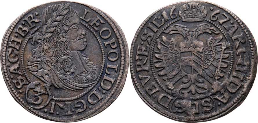 3 Krejcar 1667 SHS, Vratislav-Hammerschmidt, dělení opisů: "...R.I.(3).S.A.../...A.(SHS).D.BVR.ET.SIL.", MKČ.1619, Nech.737, 1.771g, vady razidla, patina